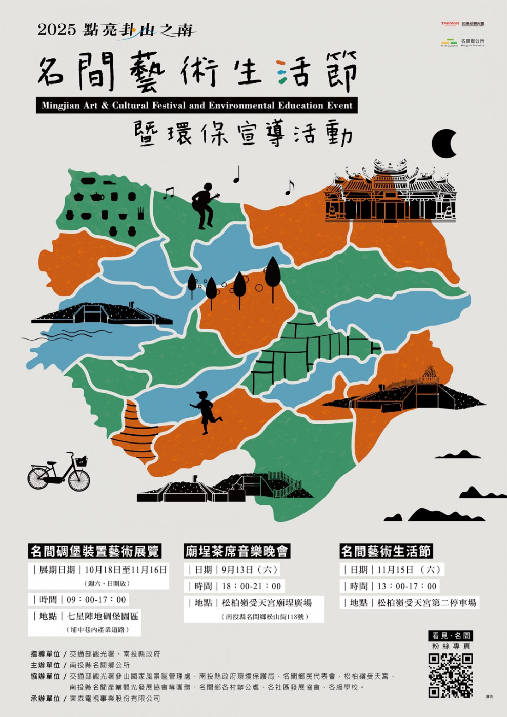 (三) 11月15日(六)下午1時至5時為「名間藝術生活節」將於名間鄉松柏嶺遊客中心斜對面廣場舉行,親子劇團、藝文展演、市集及環保宣導等多元活動