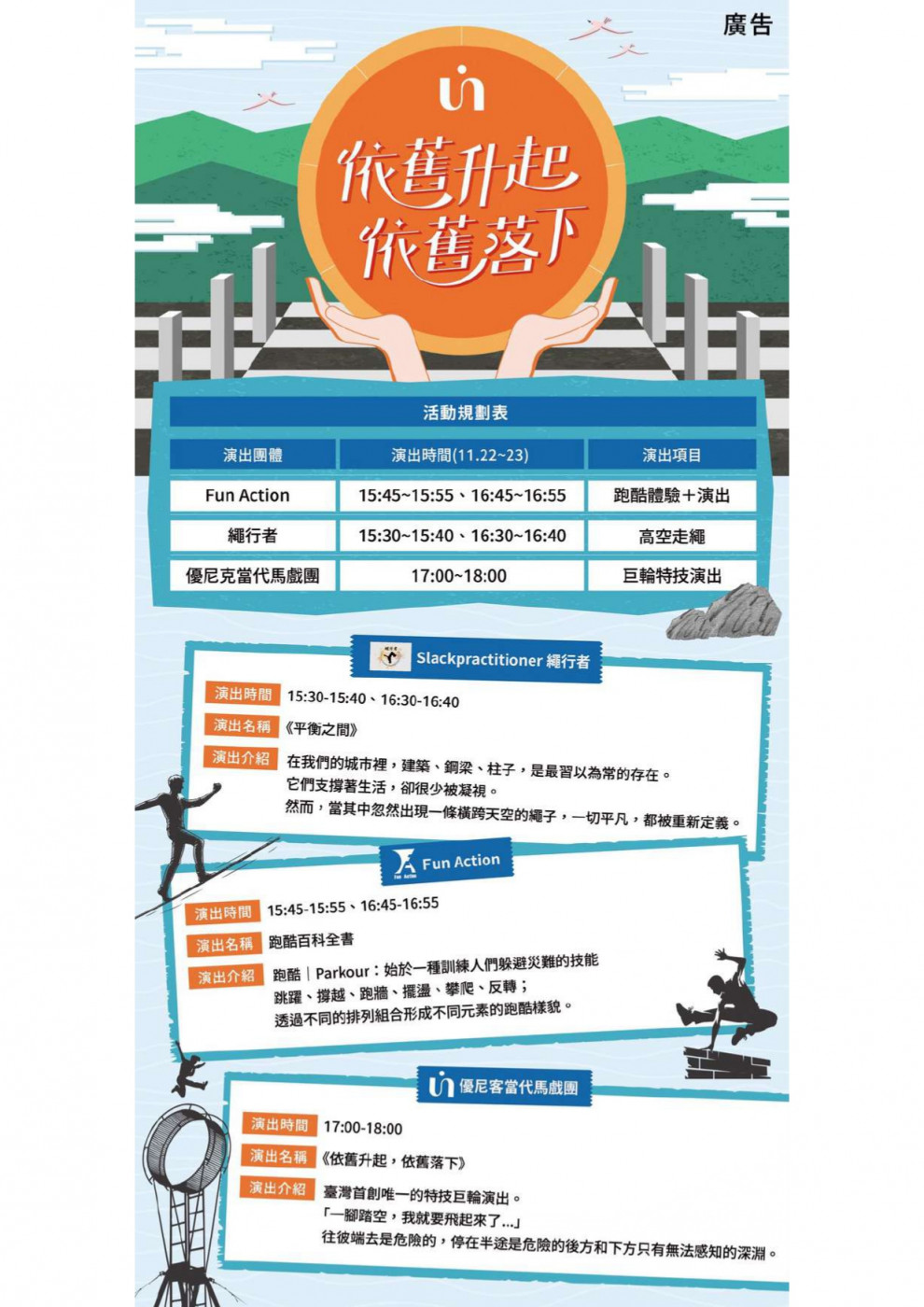 跑酷演出: 《跑酷百科全書》15:45-15:55 、《蹦床籃球》16:45-16:55