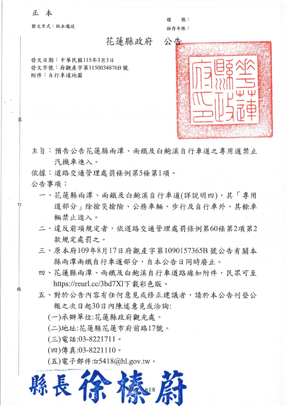 轉知 ⊗ 「本縣兩潭、兩鐵及白鮑溪自行車道之專用道禁止汽機車進入」公告草案